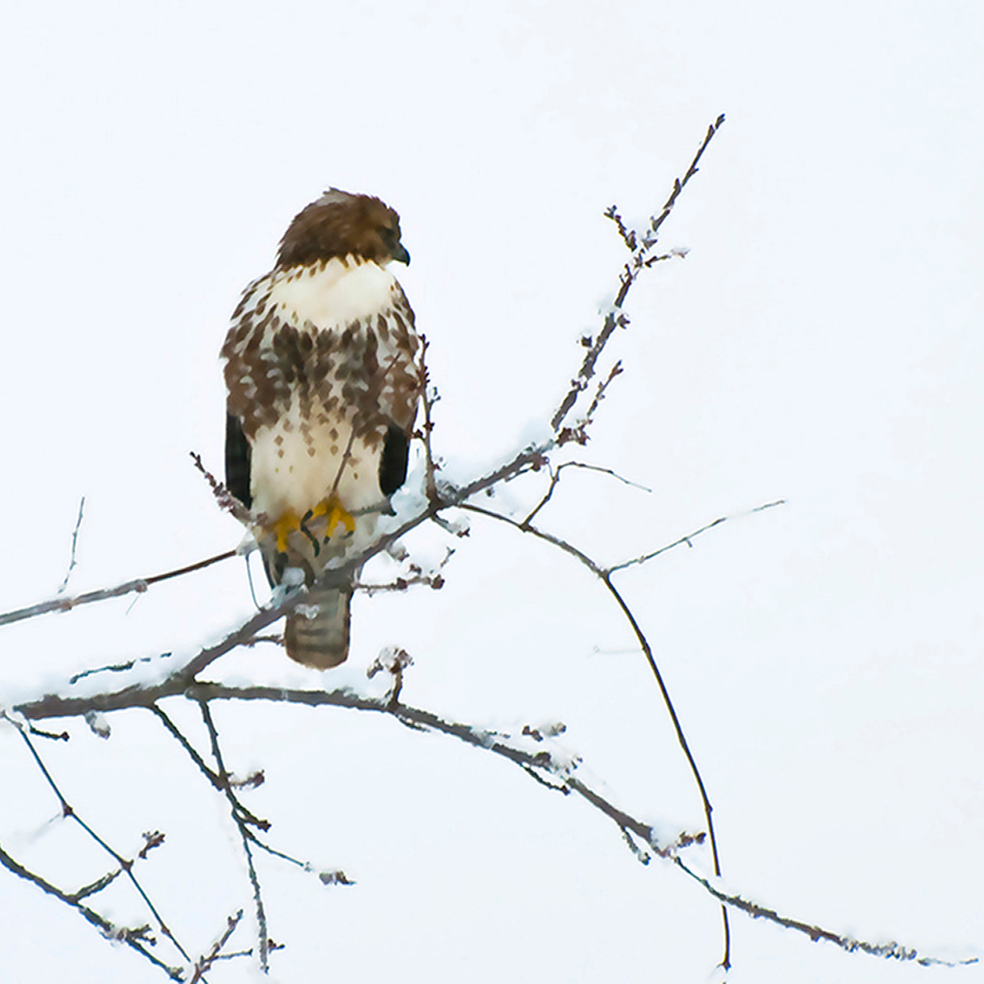 The red-tailed hawk circles frozen, snow-laden woodlands.